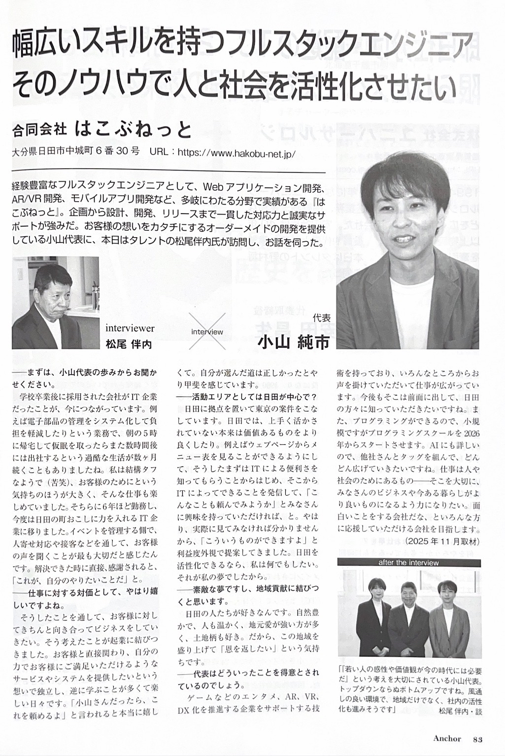 2026年2月1日発刊の経営情報誌『Anchor(アンカー)2026年2月号』に、弊社CEO兼CTO 小山純市のインタビュー記事が掲載されました。